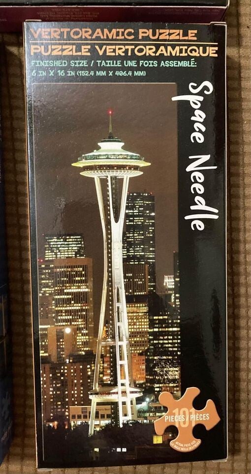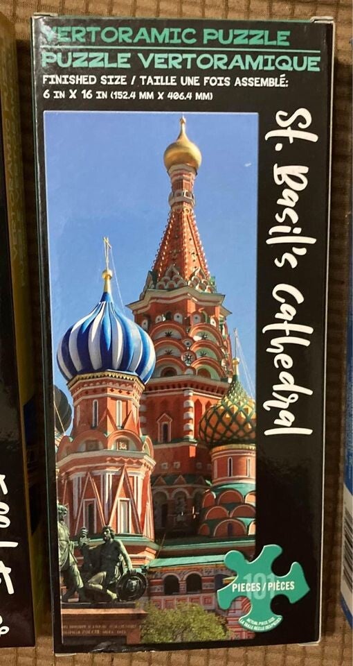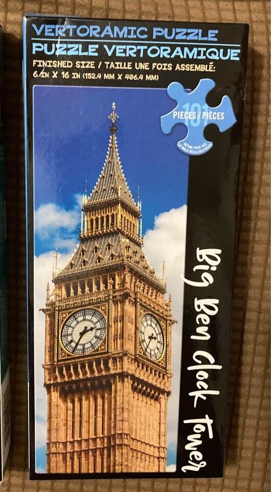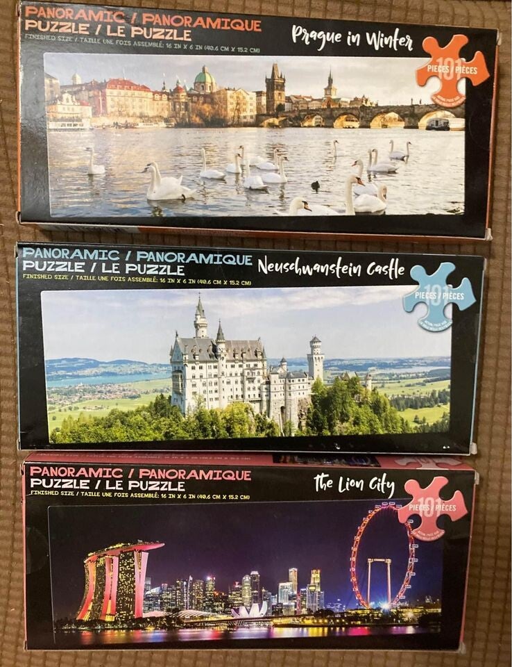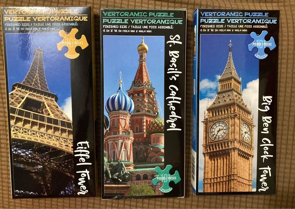 Each classic puzzle on cardboard features a famous world landmark or place. The puzzles measure approximately 16 inches by 6 inches each.