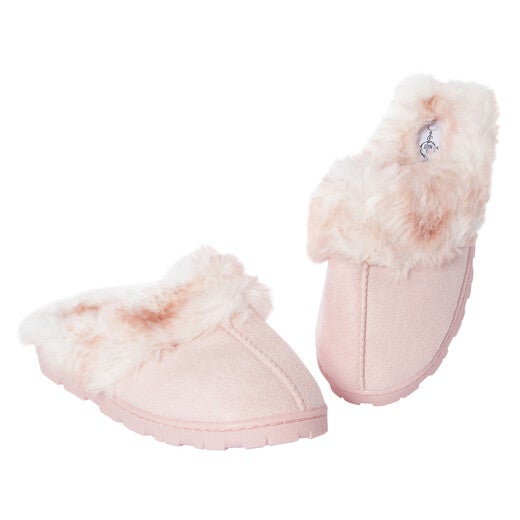 They are scuff slippers with tread sole, faux suede & fur upper color varieties: pink, black, brown
