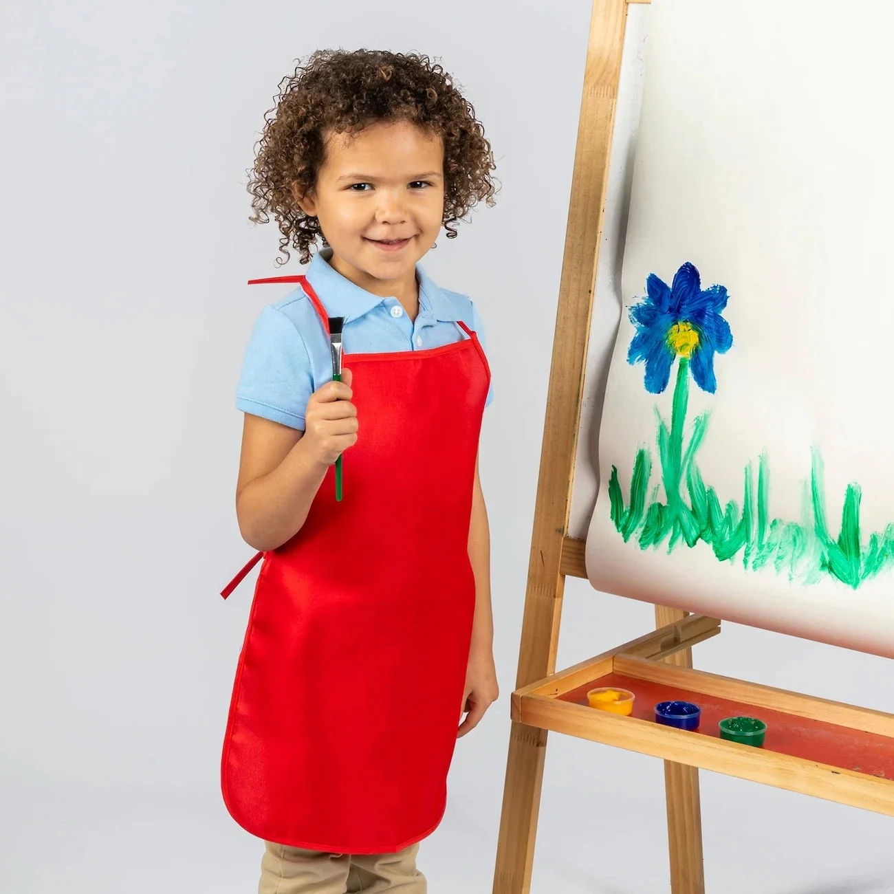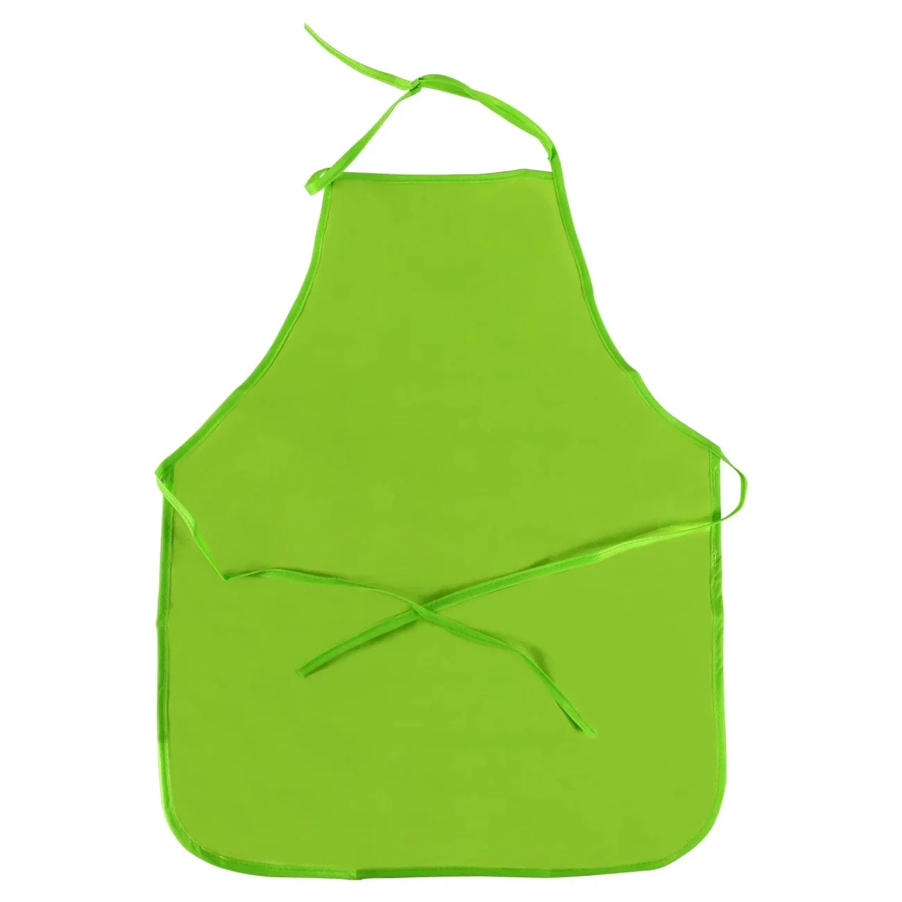 Fabric aprons have ties at neck and waist. Choose from red, blue, green, or yellow. One size fits modt kids ages 3-8 years old.