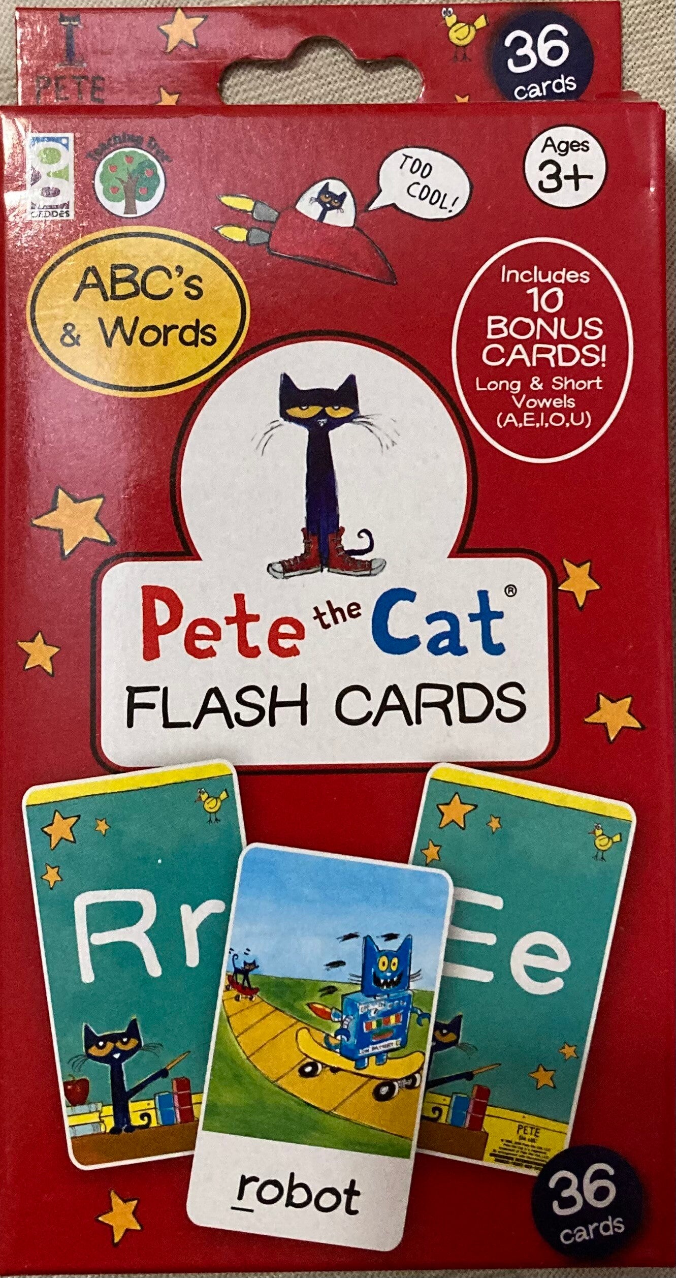 Learning the ABC’s has never been so easy! Start by holding up the letter side towards your child, and say the letter out loud. Then say the sound of the letter. Flip the card over to show the Pete the Cat illustration and a word that relates to the letter.