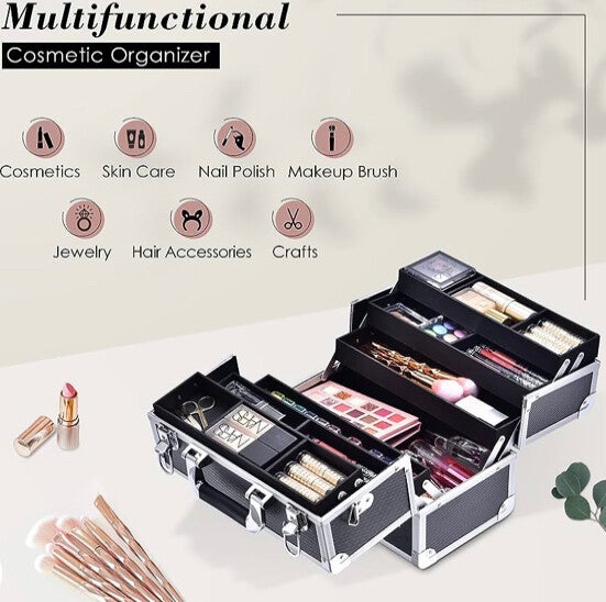 This case features 6 tier trays with compartments. This can be used as a professional makeup box, hair accessories styling case, jewelry, art supplies, medication storage & more!