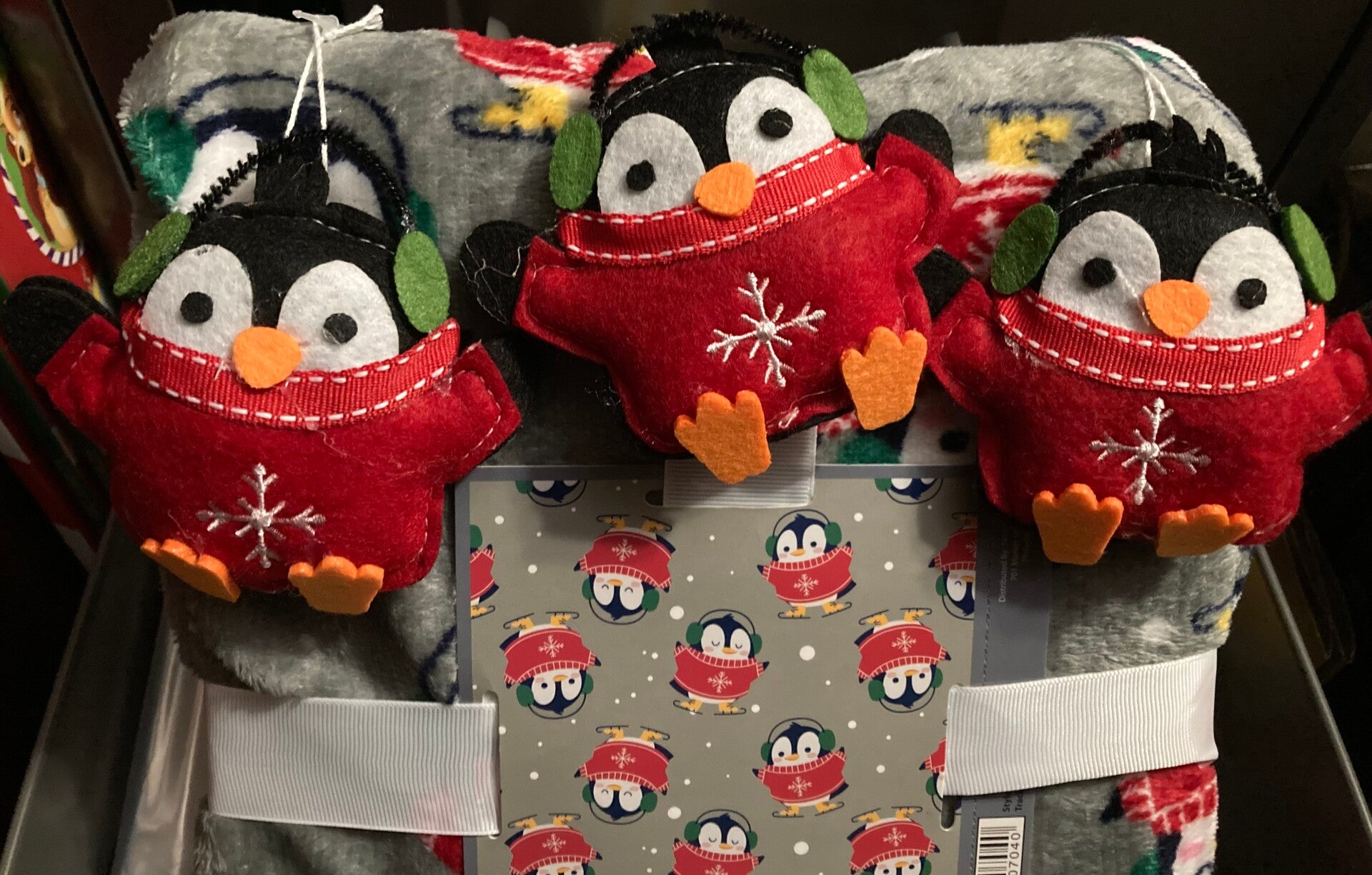 Holiday Ornaments Cuddle Bundle - Trio of Penguin Ornaments & Coordinating Throw Blanket