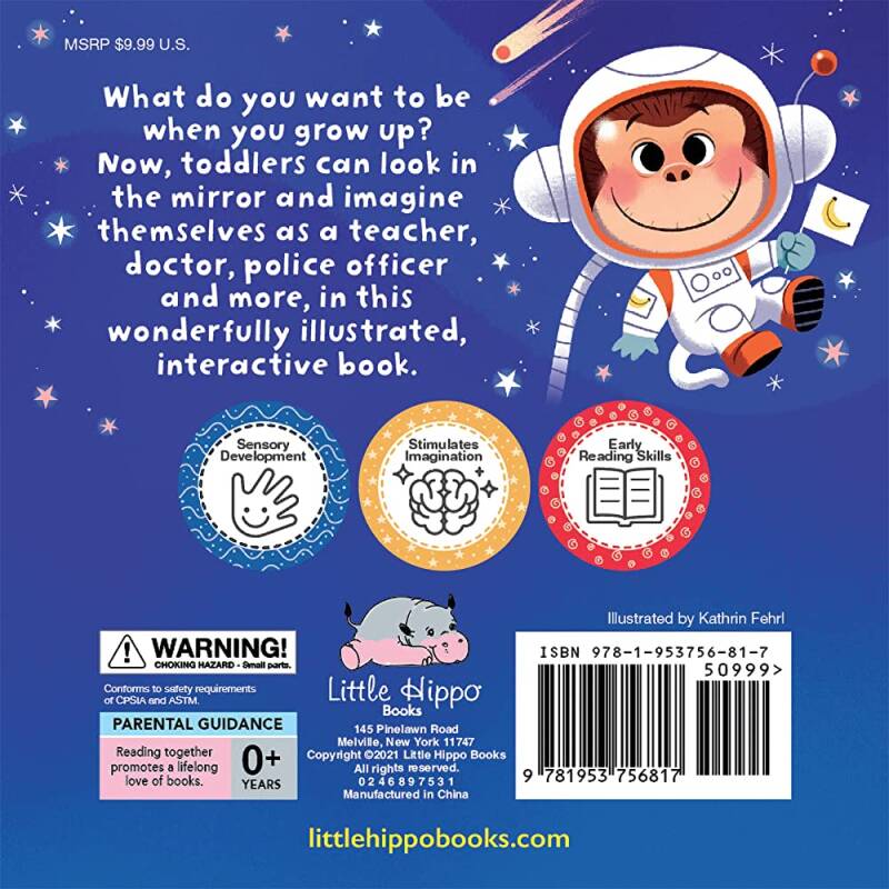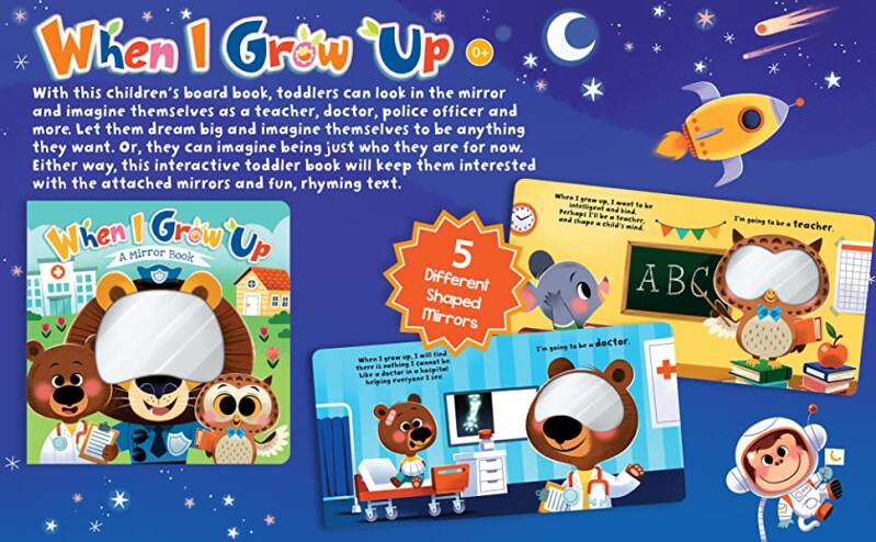 In When I Grow Up, kids can think about what they might want to be when they grow up. With this children's board book, toddlers can now look in the mirror and imagine themselves as a teacher, doctor, police officer and more. Let them dream big and imagine themselves to be anything they want. Or, they can imagine being just who they are for now. Either way, this interactive toddler book will keep them interested with the attached mirrors and fun, rhyming text.