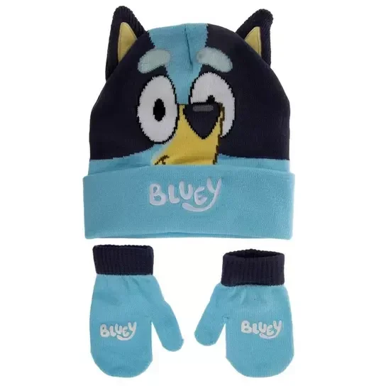 This set features a pair of blue mittens with the name "Bluey" written in white print on one side. The beanie is styled like Bluey's head with her ears at the top. Keep your little one warm all season long when they wear this accessory set!