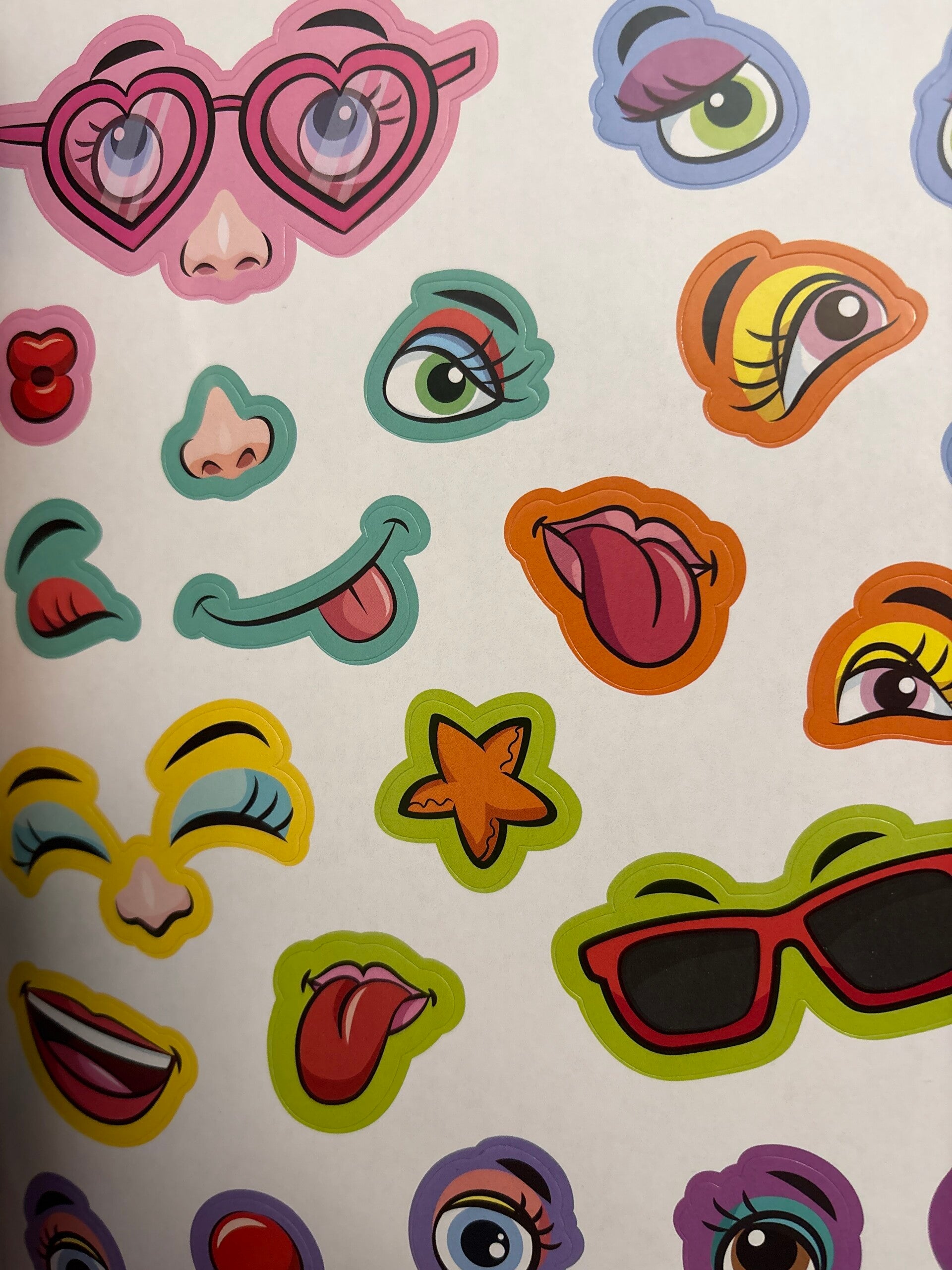 Kids are encouraged to decorate each page with stickers of different facial features. Mix & match eyes, mouths, & noses—there are no rules! Kids can decorate as they see fit